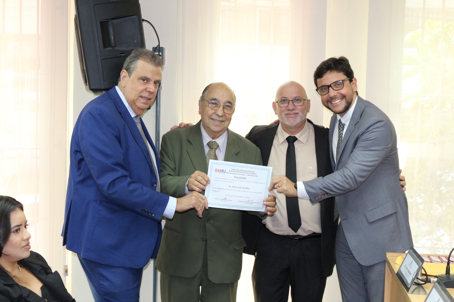 Nossa cerimônia contou com a presença do Dr. Hilário Franklin, Presidente da Primeira Subseção Nova Iguaçu, Dr. Antônio de Pádua Won-Held, Vice-Presidente da Primeira Subseção Nova Iguaçu, Dr. Fábio Telles, Conselheiro da Primeira Subseção Nova Iguaçu, Dr. Carlos Bardasson, Membro da Comissão de Apoio ao Jovem Advogado – CAJA e do nosso querido paraninfo, Dr. Julio Cesar da Silva. 🤝 . 🤝